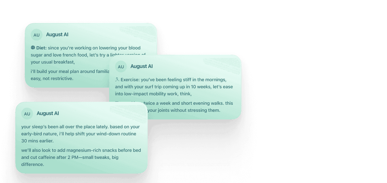 From diet & sleep to exercise & stress—August creates a hyper-personalised wellness plan based on your health history, habits, goals & needs. A plan for your healthy life.